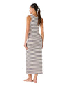 El Vestido Turin Canaria presenta una silueta midi ajustada que define la figura con equilibrio. Su escote redondo se complementa con aberturas frontales conectadas por conchas nácar, creando un detalle distintivo que aporta carácter al diseño. La textura a rayas mantiene una estética limpia y estructurada.