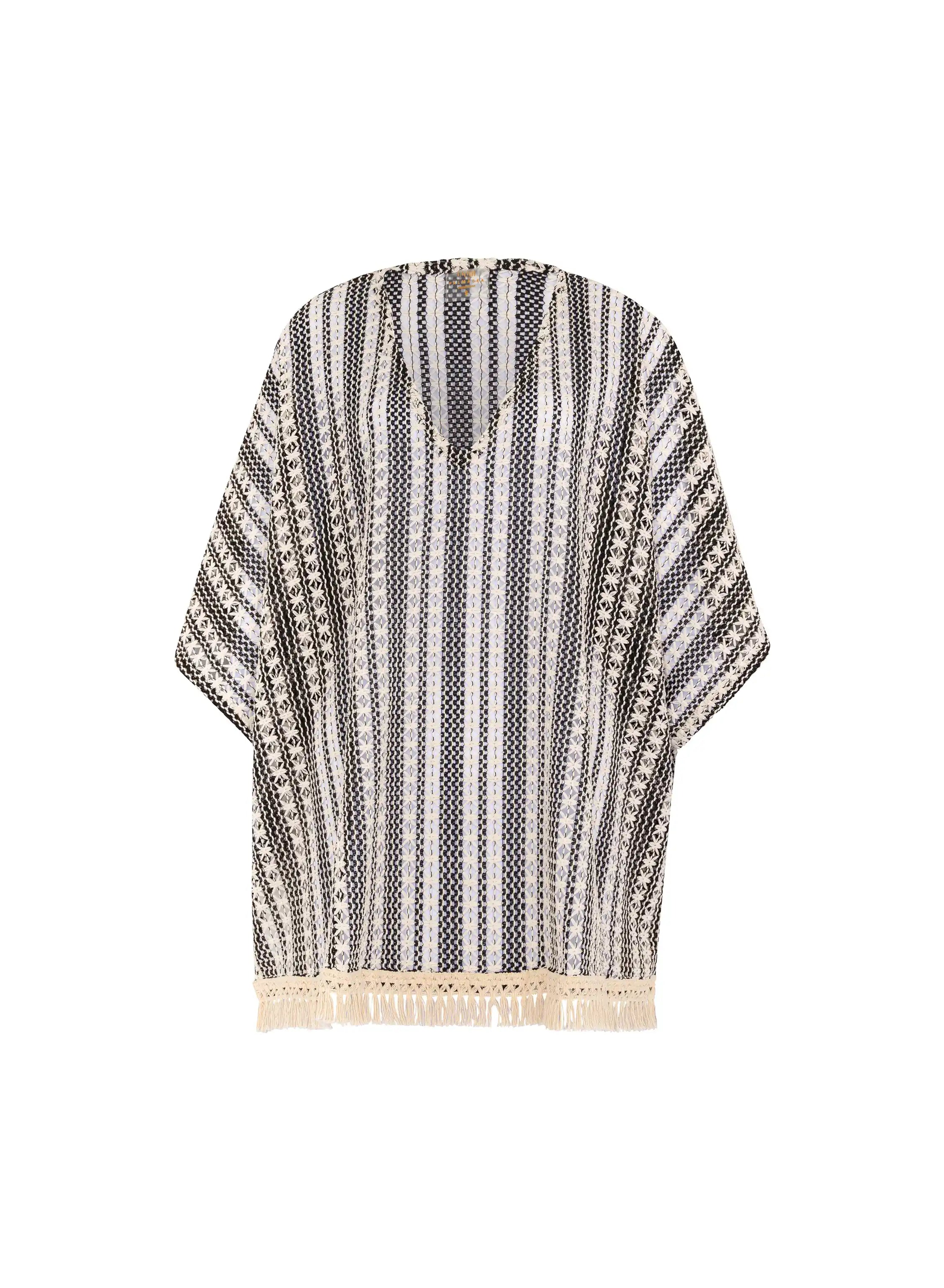 El Sasa Poncho Onyx es la pieza perfecta para completar tu look de playa con elegancia y movimiento. Su diseño ligero y fluido, con flecos en el contorno inferior, le aporta un aire bohemio y sofisticado. Ideal para usar sobre tu vestido de baño o como una salida versátil para tardes soleadas.