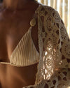El Top Kuna Shell Ivory presenta una silueta triangular clásica en textura acanalada. Sus amarres ajustables permiten adaptar el fit, mientras las piedras decorativas ubicadas en las tiras aportan carácter sin alterar su estructura limpia.