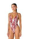 El Vestido de Baño Entero Numa Vineta combina líneas limpias con un aire contemporáneo. Su escote profundo y espalda descubierta con tiras ajustables realzan la figura con naturalidad. Confeccionado en tejido elástico con estampado orgánico en tonos vino y crema, ofrece un equilibrio entre soporte, flexibilidad y sofisticación.