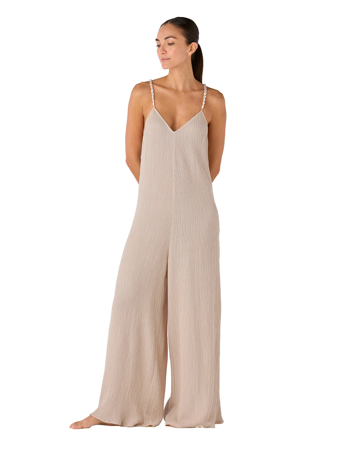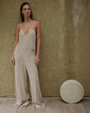 El Kimono Bali Mimosa presenta una silueta amplia con escote profundo en V y espalda abierta. Su mezcla de viscosa y lino aporta ligereza y movimiento natural, mientras las tiras delgadas con piedras decorativas suman un detalle sutil a su estructura.