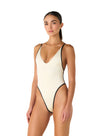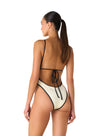 El Vestido de Baño Entero Numa Ivory combina pureza y estructura en una silueta de líneas limpias. Su escote profundo y la espalda descubierta acentúan la figura con elegancia, mientras las tiras delgadas ajustables enmarcan el cuerpo con sutileza. El contraste de color en los bordes define un diseño moderno que equilibra sencillez y sofisticación.