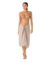 El Tali Pareo Mimosa presenta una silueta envolvente que se ajusta con naturalidad al cuerpo. Su diseño cruzado permite adaptarlo con comodidad, mientras las conchas decorativas aportan un detalle sutil que eleva la pieza. La textura ligera del tejido genera una caída fluida y movimiento suave, ideal para complementar el vestido de baño con equilibrio y sofisticación.