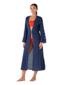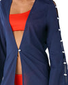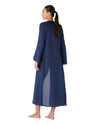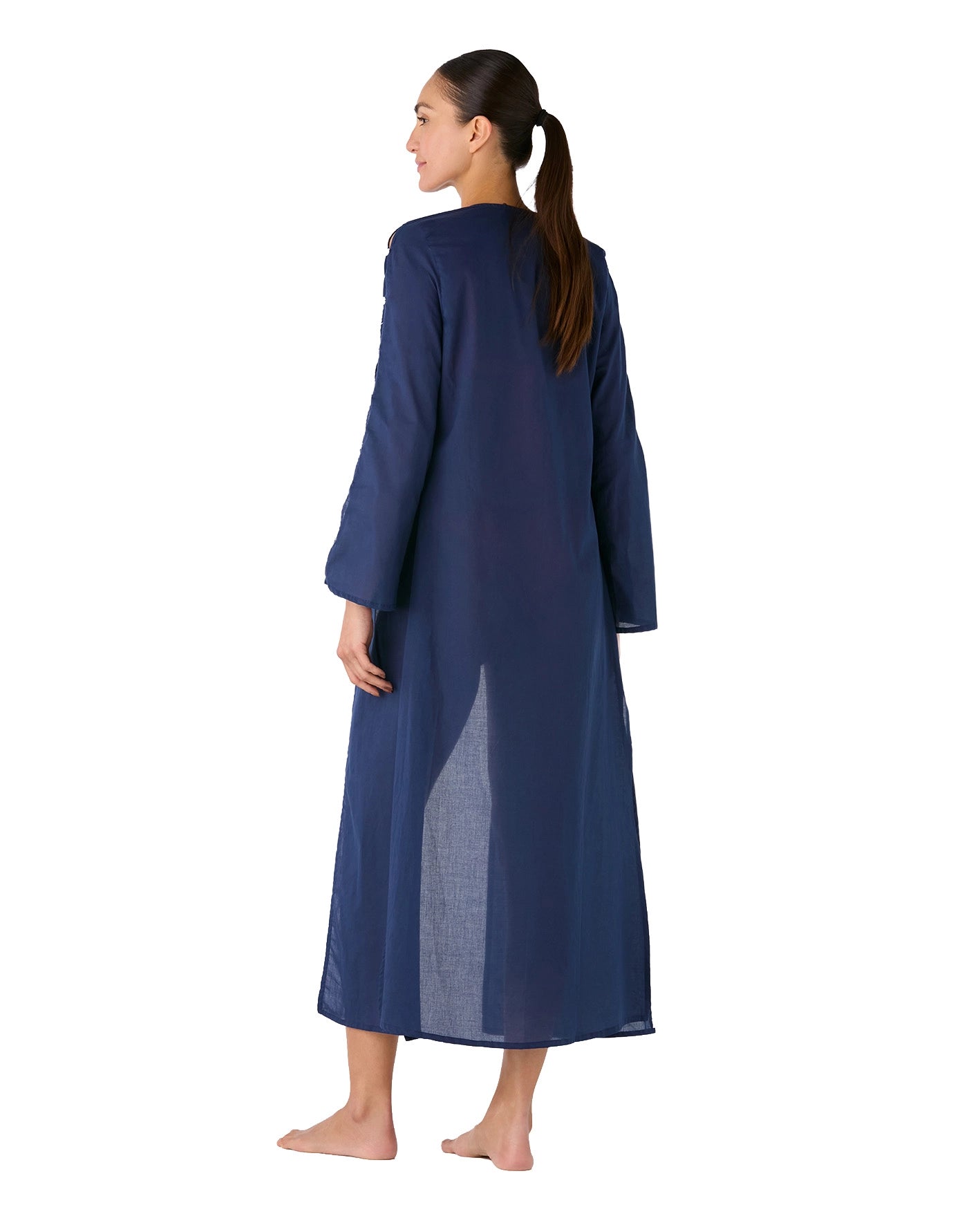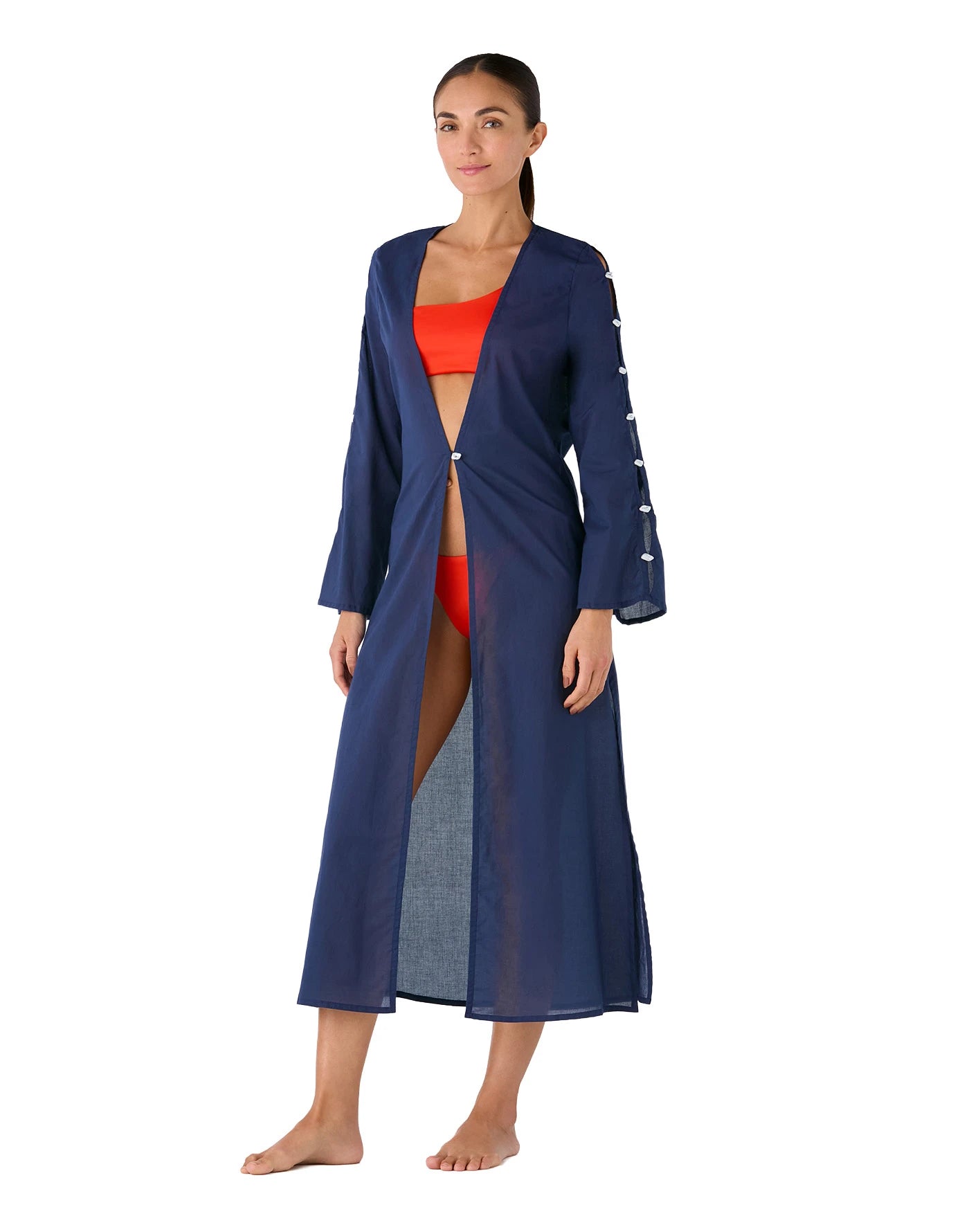 La Bata Ude Ocean presenta una silueta larga y fluida confeccionada en algodón liviano. Su tono navy profundo potencia la línea alargada, mientras las conchas sutiles en la apertura de las mangas aportan dimensión discreta. Diseñada para superponer con naturalidad sobre el vestido de baño.